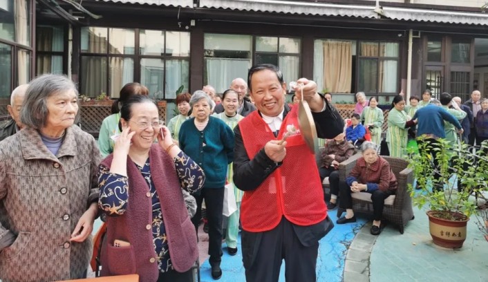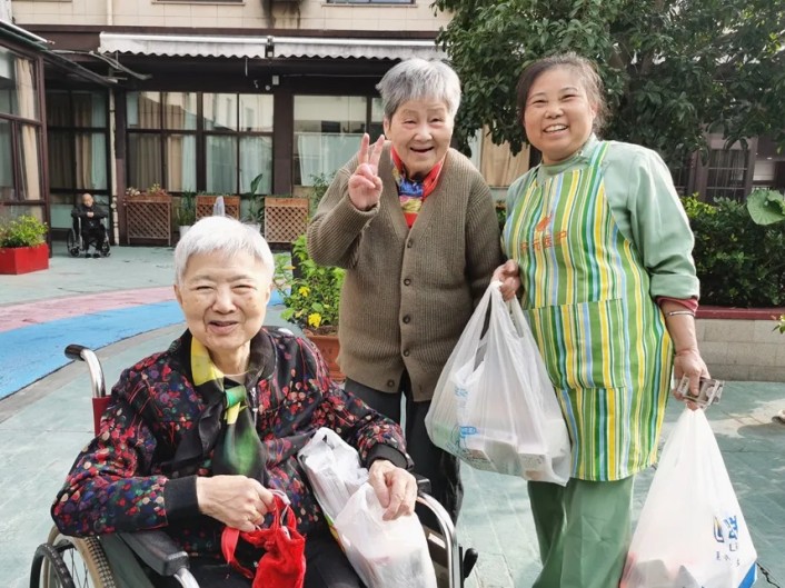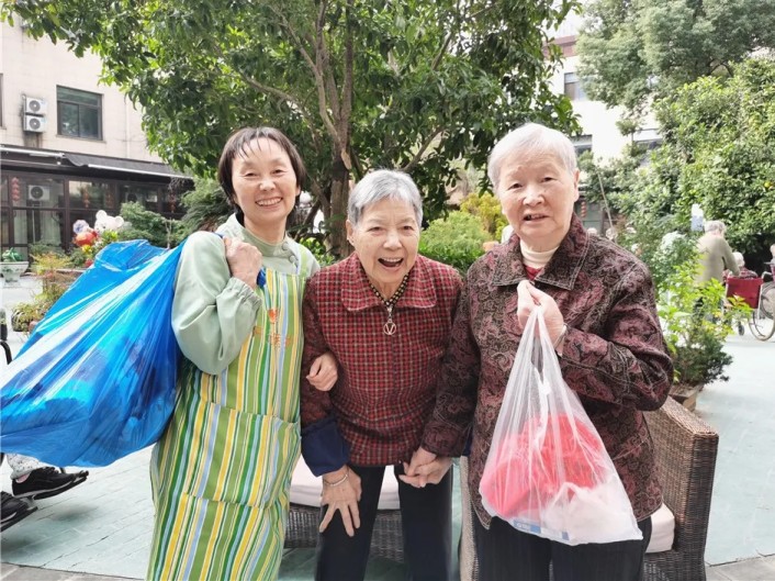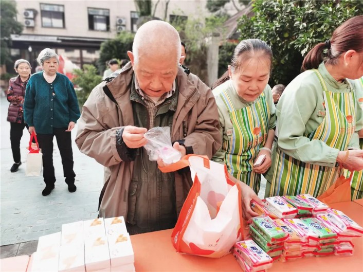 在开元之心颐养园,每年的双11总是特别热闹。今天早上,阳光正好,中庭花园早早摆好了一排摊位,为爷爷奶奶们准备了一场专属的购物盛宴。